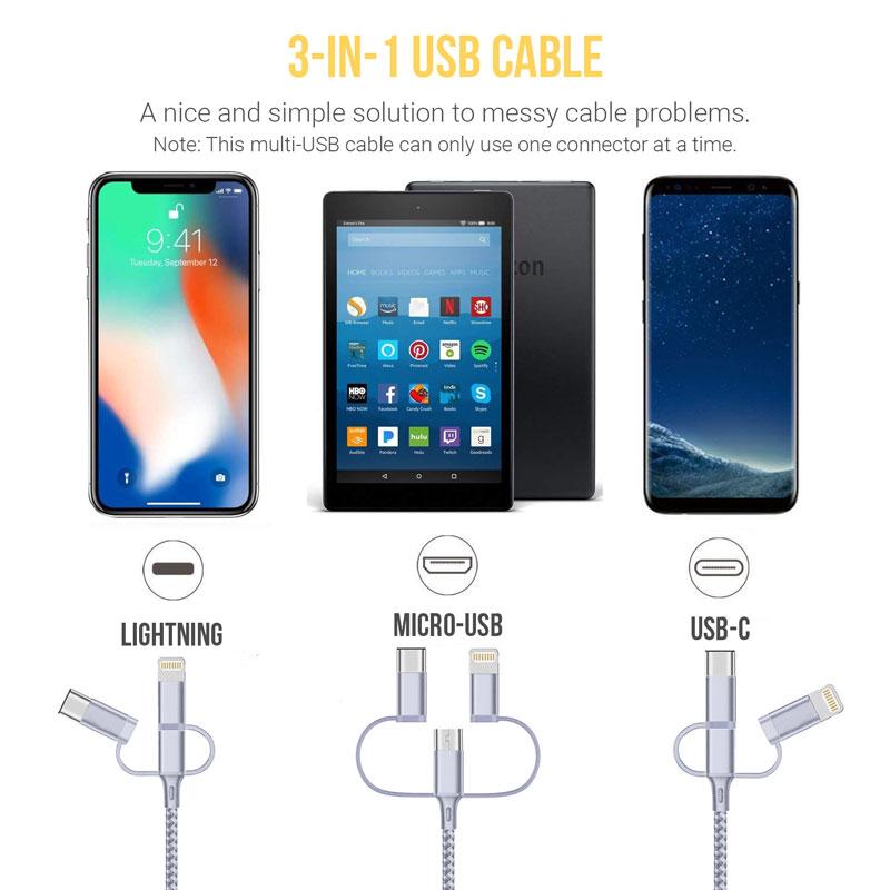 The FuelBox LightSpeed cable is a 3-in-1 data sync and charging cable (Micro USB + Apple lightning + USB-C) for all your phones, tablets and other favorite electronic devices.• Aluminum charging...